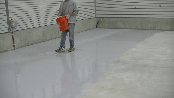 Next, you'll want to broadcast the flake into the wet base coat. I wear spiked epoxy shoes and walk right back into it. I have my 5 gallon bucket full of flake, reach inside and grab a handful, then throw them upwards so they spread out as they fall into the epoxy.