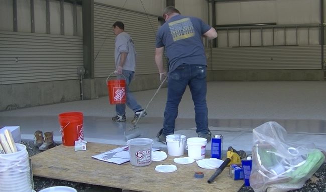 After you're done with the PREP work, vacuum the concrete thoroughly and you're ready to apply the base coat of epoxy.
