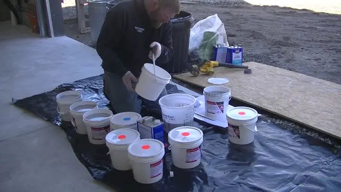 The first thing I like to do is set up my mixing station. Being organized and understanding how to mix your epoxy (or polyaspartic) coating is extremely important.