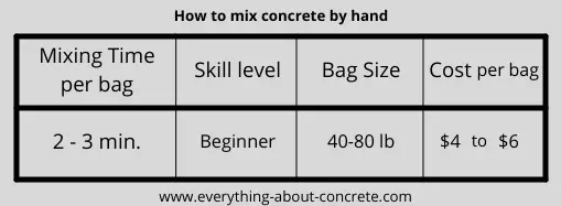 If you're using an electric concrete mixer machine it'll speed up the mixing process because you can mix 2 - 3 bags of concrete at one time. (depending on the size of your mixer)