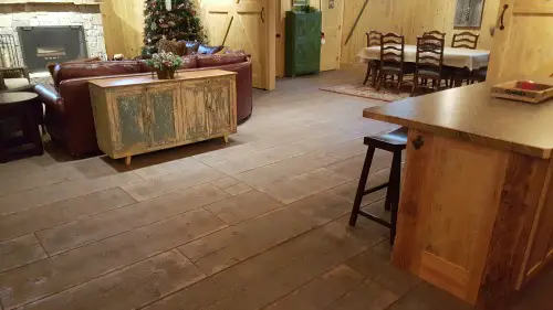 In the picture above, we stamped a concrete floor in a 16" barn board pattern. This was an interior floor for a customer's man cave. The stamp pattern had a lot of wood grain and knots for a very realistic look. The customer was very happy with this floor.