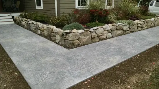 For the concrete walkway shown above we stamped the concrete in a stone texture. This is just a textured stamping mat with no lines or pattern. It gives the concrete surface the texture of natural stone making it a good pattern for a non-skid application.