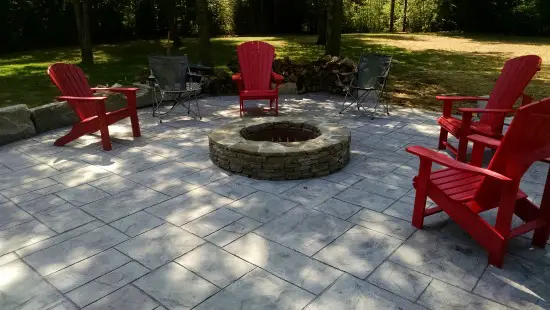 For this concrete patio we used Ashlar slate stamps. This is one of the most popular patterns we install. We use this pattern for pool decks, sidewalks, driveways, and patios like the one above.