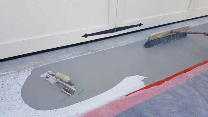 In the picture below, we're using a self-leveling concrete overlay that's about 1/8" thick to resurface an existing concrete floor.