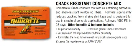 Crack Resistant concrete has cement, sand, and gravel, but also has air-entraining admixture and reinforcing fibers. This recipe helps reduce cracking from drying shrinkage and can be used for structural concrete building.