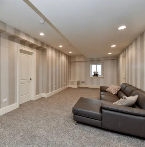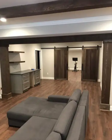 Finishing your basement this way gives you multiple design options. The dark and light colors give this room a great contrast.