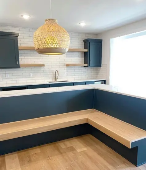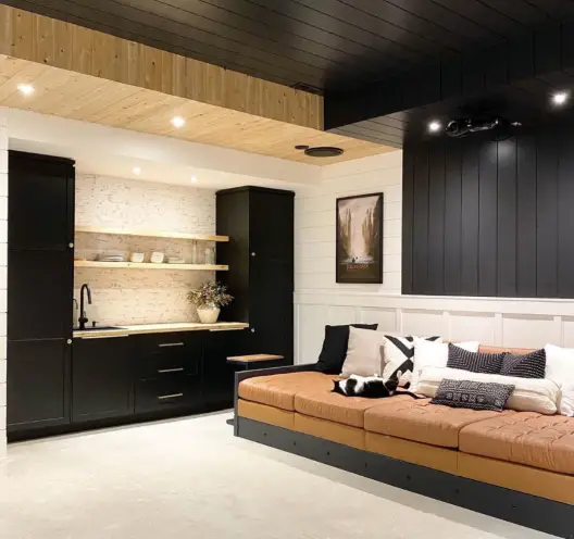 Using a combination of wood paneling, shiplap paneling and wood cabinets is another way to cover your basement walls.