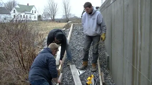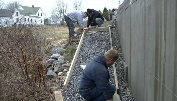 The slope of this concrete ramp was determined by the slope of the embankment, so we set the forms on the sub-grade, leveled them across (east to west) and pinned them in place using metal stakes that had holes in them.